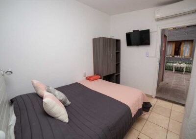 Cama matrimonial o doble individual (solicitar), ideal para amigos, compañer@s de trabajo, parejas (opcional más niño o mascota). Vista y salida al deck y piscina, separada del edificio central del Hostel. Planta baja.